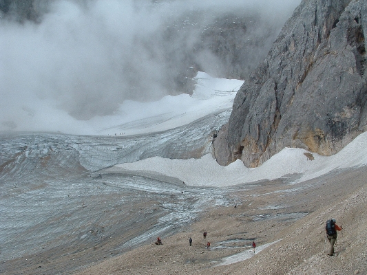 15:00 Uhr stiegen wir ab. Erst über Schneefelder, dann an Seilen
