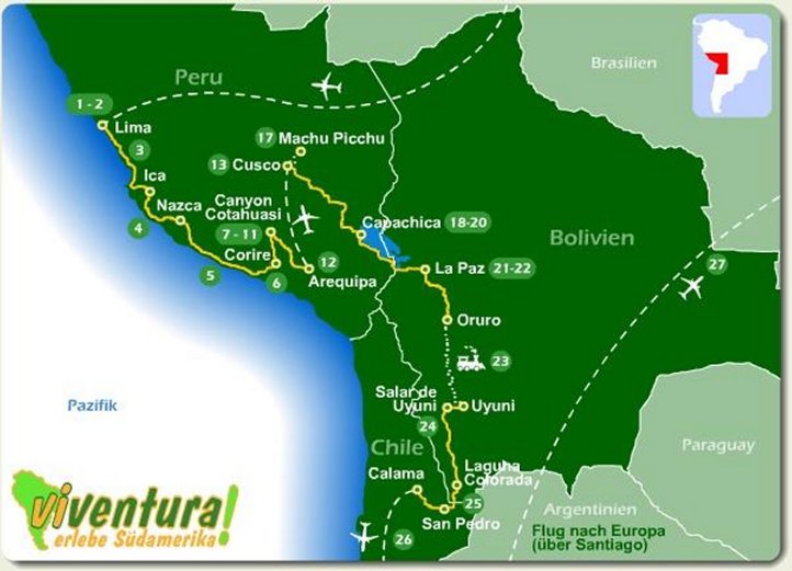 der Ruhe mit Zeit zum Baden gehen und Tagebuch schreiben. Rund um La Paz Gegen Abend erreichten wir La Paz. Dort waren zwei Übernachtungen, Stadtrundfahrt und Shopping geplant. Zugleich gab es zwei verlockende Zusatzangebote. Wir hatten die Möglichkeit auf den Pico Austria (5.400 m )zu steigen und eine Mountainbike- Tour von La Paz (La Cumbre-Pass, 4650 m ) nach Coroico (1.750 m) auf der legendären und berüchtigten "Death Road" zu machen. Diese Angebote ließen wir uns nicht entgehen. Beide Ausflüge waren tolle Erlebnisse, die sich auf jeden Fall gelohnt haben, auch wenn die Stadt La Paz dabei etwas zu kurz kam. Salar de Uyuni Mit dem Linienbus nach Oruro verließen wir La Paz nach der zweiten Nacht. In Oruro stiegen wir in die Bahn und weiter ging es nach Uyuni. Von Uyuni sollte es dann per Jeep in Richtung chilenische Grenze gehen. Zuvor erwarteten uns noch die Salzwüste (Salar de Uyuni) und das vulkanische Hochland. Landschaftlich starke Eindrücke. In der Salzwüste machen wir einem Abstecher zur Insel Incahuasi ("Haus des Inca") mit ihren bis ca. 20 m hohen Säulenkakteen die teilweise mehr als 1.200 Jahre alt sein sollen und besichtigen ein Hotel welches vollständig aus Salzblöcken errichtet wurde. Nach einer kurzen Nacht in einem kleinen Ort am Rande des Salzsees, starteten wir früh am Morgen (4:30 Uhr) zu unserer letzten Etappe. Mit der aufgehenden Sonne durchquerten wir die bolivianische Hochebene, passierten heiße Quellen und kleine Vulkane. Wir waren beeindruckt von den Farbspielen der Laguna Colorada und der Laguna Verde und konnten Hochlandflamingos und Vikunjas beobachten. Gegen Abend erreichten wir die bolivianisch- chilenische Grenze. In San Pedro de Atacama übernachteten wir ein letztes Mal. Am nächsten Morgen hieße es dann in Calama Abschied nehmen. Wir verabschiedeten uns von unserer netten Reiseleiterin Tanja, die uns sehr ans Herz gewachsen war und die während der ganzen Reise alles im Griff hatte. Von Calama flogen wir nach Santiago de Chile und von dort nach kurzem Aufenthalt nach Europa zurück. Tagebuch http://www.viventura.de/reisebericht/1209
